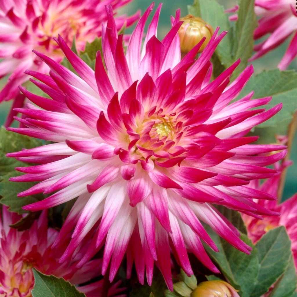 - Fully double white cactus dahlia with magenta purple tips. The eyecatching blooms are up to 15cm wide with long, spiky velvety petals and the strong stems remain upright even in heavy rain
