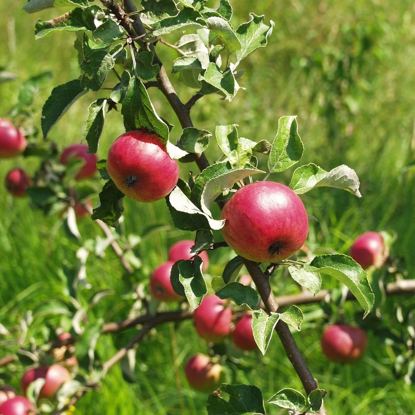 - Produces medium sized round, mostly bright red apples